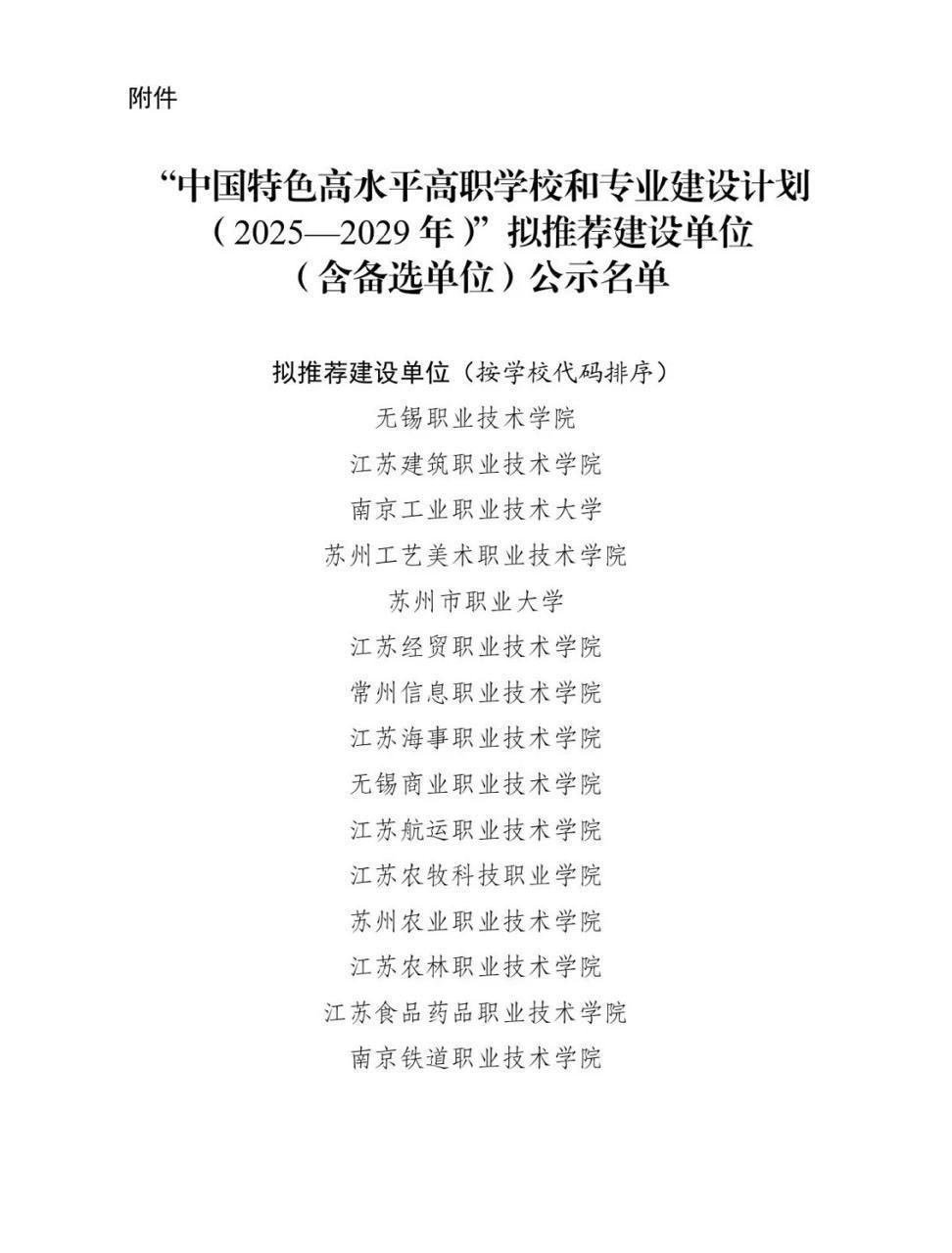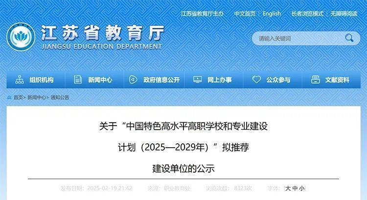 2月19日,江苏省教育厅发布《关于“中国特色高水平高职学校和专业建设计划(2025—2029年)”拟推荐立项建设院校的公示》。